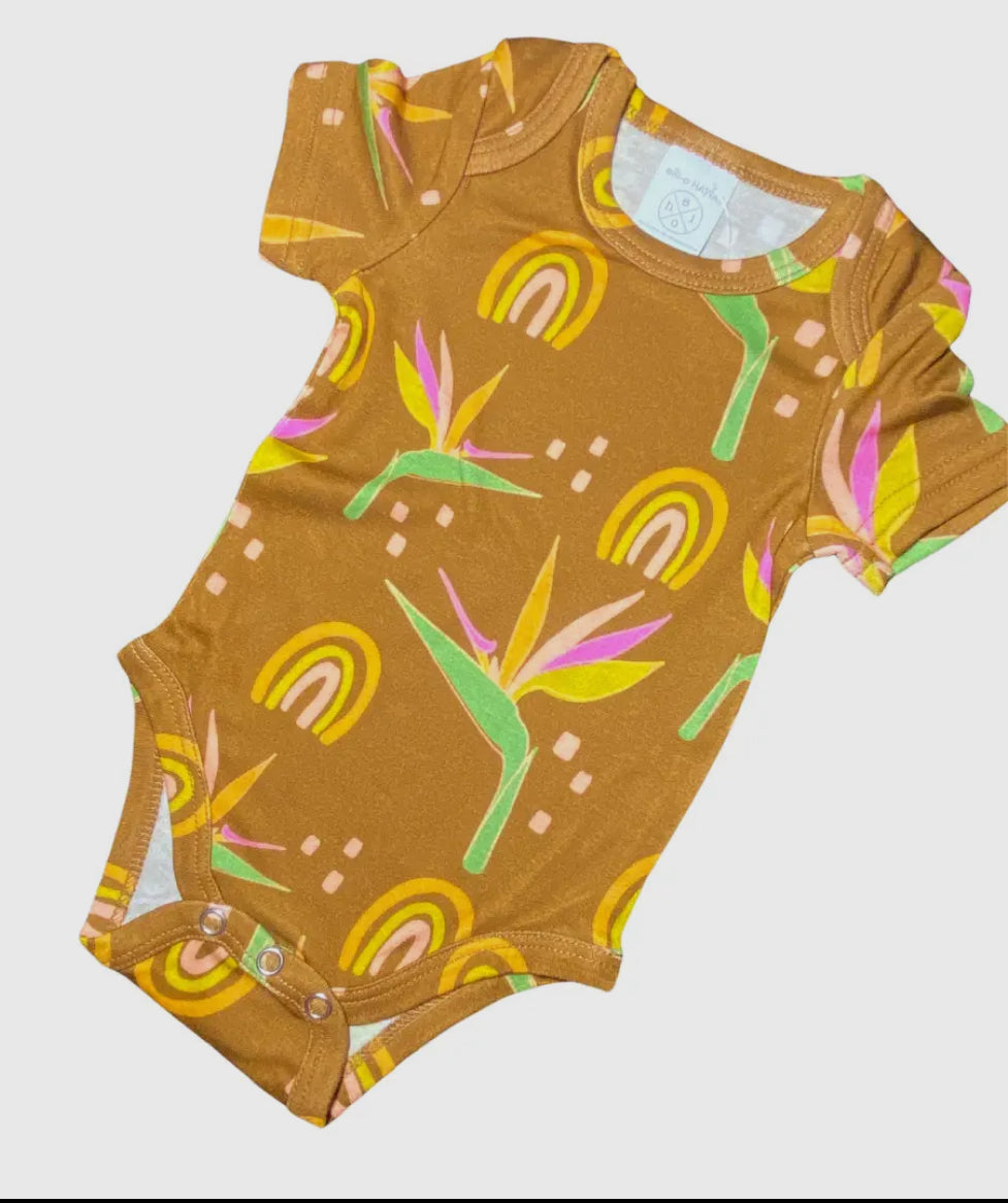 This retro paradise print hilights the bird of paradise, a flower that is in many floral arrangements and grows in many backyards on the islands of Hawaii. All of this lines fabrics feature original prints designed in the special town of Hilo, on the big island. They focus on making clothes easy for babies to live in and remind you of old Hawaii. Retro and relaxed style. Fabric is 70% bamboo and 30% organic cotton.